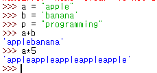- 문자열을 붙이고 싶으면 +, 반복하고 싶으면 *를 사용한다