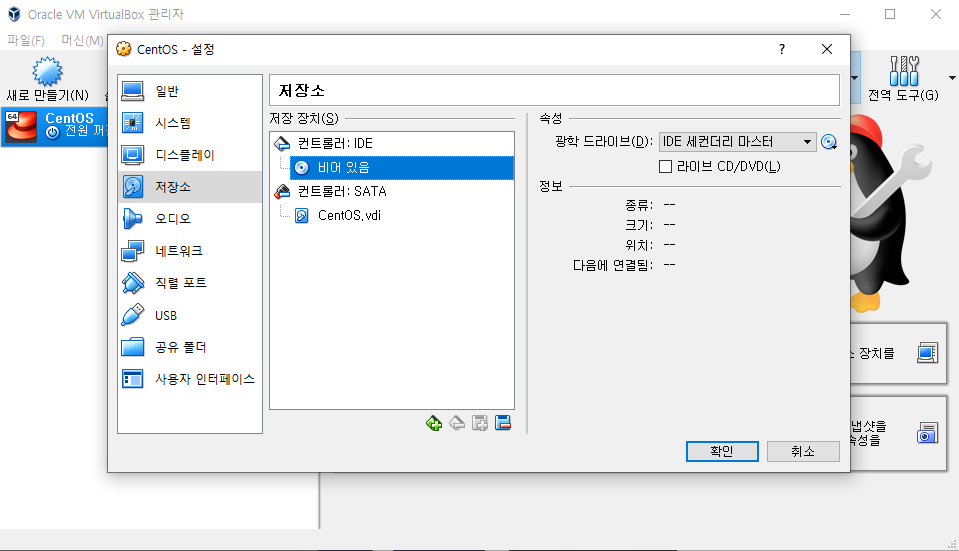 - 설정-저장소- 비어 있음 클릭 후 IDE 세컨더리 마스터- 가상 광디스크 선택 후 CentOS 파일 선택