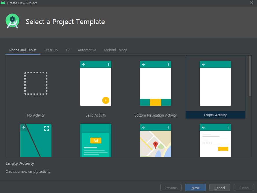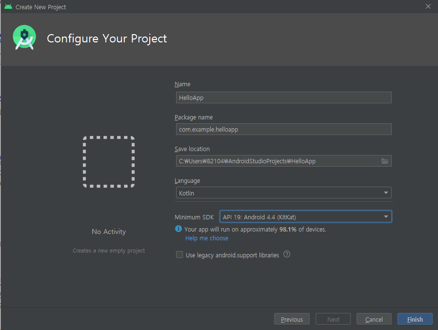 - 개발용 폰이 갤럭시 S3 이라 4.4까지로 설정(Language는 스샷은 Kotlin이나 JAVA로 변경)