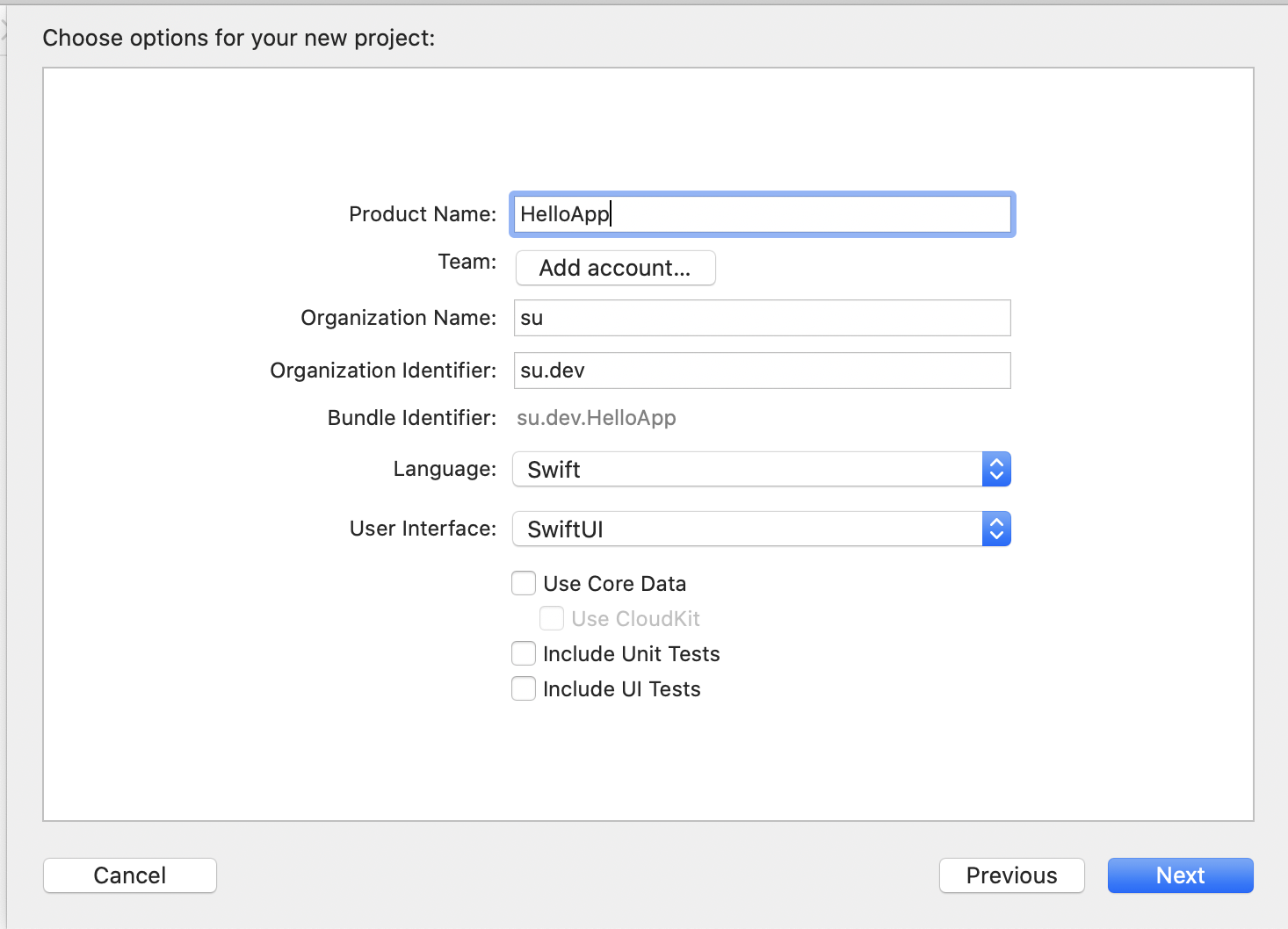 - Organization Identifier: Bundle Identifier를 생성하는데 사용되는 prefix. su.dev과 같이 도메인을 뒤집어서 사용