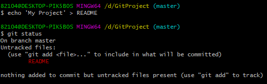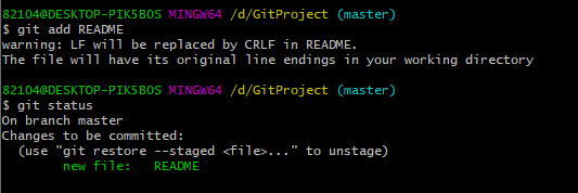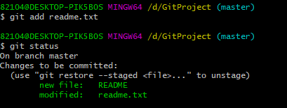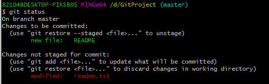 git status 명령을 다시 실행하면 README 파일이 Tracked 상태이면서 커밋에 추가될 Staged 상태라는 것을 확인할 수 있다.