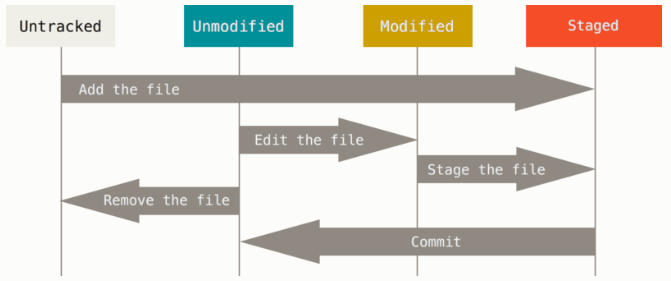 워킹 디렉토리의 모든 파일은 크게 Tracked(관리대상임)와 Untracked(관리대상이 아님)로 나눈다. Tracked 파일은 이미 스냅샷에 포함돼 있던 파일이다. Tracked 파일은 또 Unmodified(수정하지 않음)와 Modified(수정함) 그리고 Staged(커밋으로 저장소에 기록할) 상태 중 하나이다. 간단히 말하자면 Git이 알고 있는 파일이라는 것이다.
