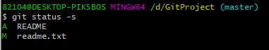 git status 명령으로 확인할 수 있는 내용이 좀 많아 보일 수 있다. 사실 그렇다. 좀 더 간단하게 변경 내용을 보여주는 옵션이 있다. git status -s 또는 git status --short 처럼 옵션을 주면 현재 변경한 상태를 짤막하게 보여준다.
