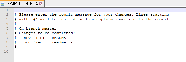 자동으로 생성되는 커밋 메시지의 첫 라인은 비어 있고 둘째 라인부터 git status 명령의 결과가 채워진다.