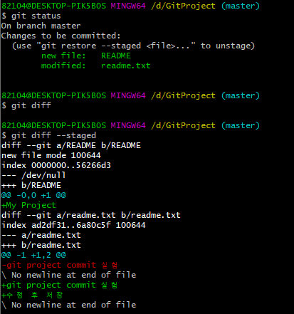 staged를 확인하려면 뒤에 --staged를 붙인다.
