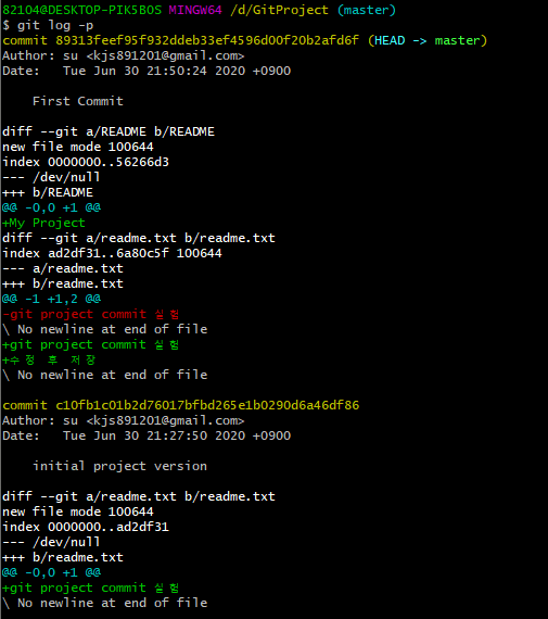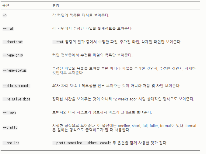 여러 옵션 중 -p, --patch 는 굉장히 유용한 옵션이다. -p 는 각 커밋의 diff 결과를 보여준다.