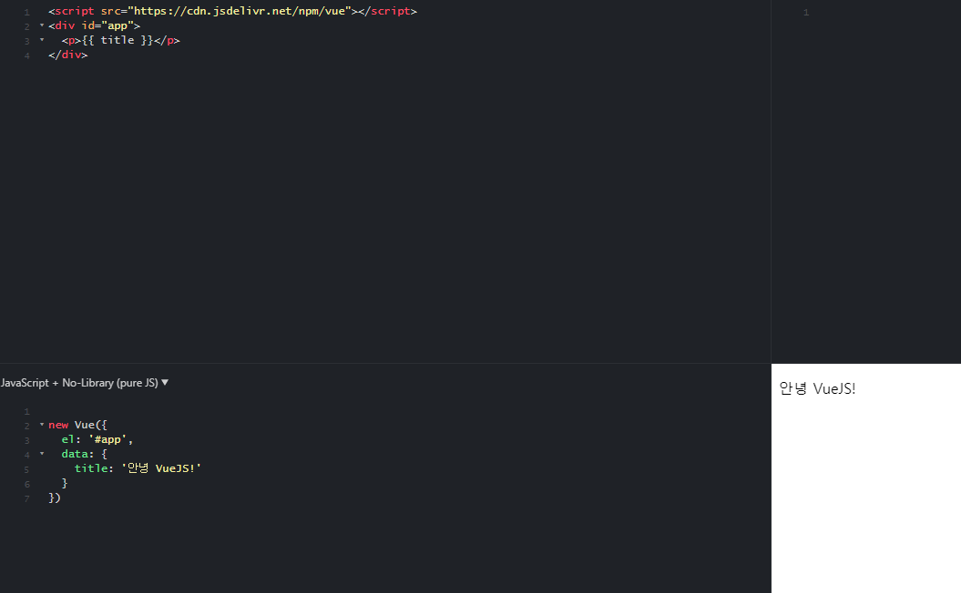 HTML과 Vue 작성 후 Run만 누르면 오른쪽에 실행 결과가 출력된다.