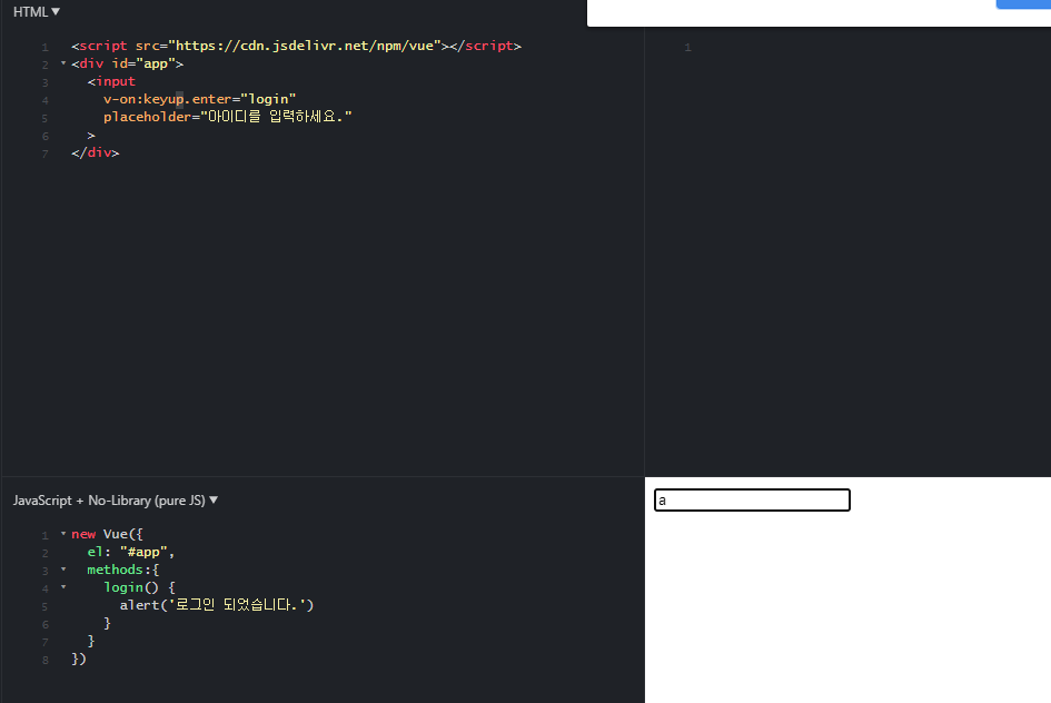 v-on:keyup.enter(키값)=”함수이름”