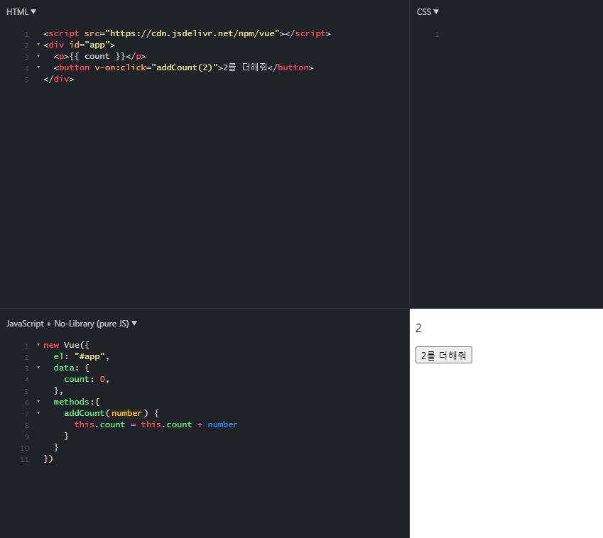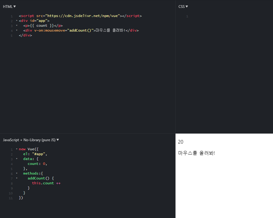 <v-on 디렉티브를 사용하여 DOM 이벤트를 듣고 트리거 될 때 JavaScript를 실행할 수 있습니다. — VueJS 공식 문서>